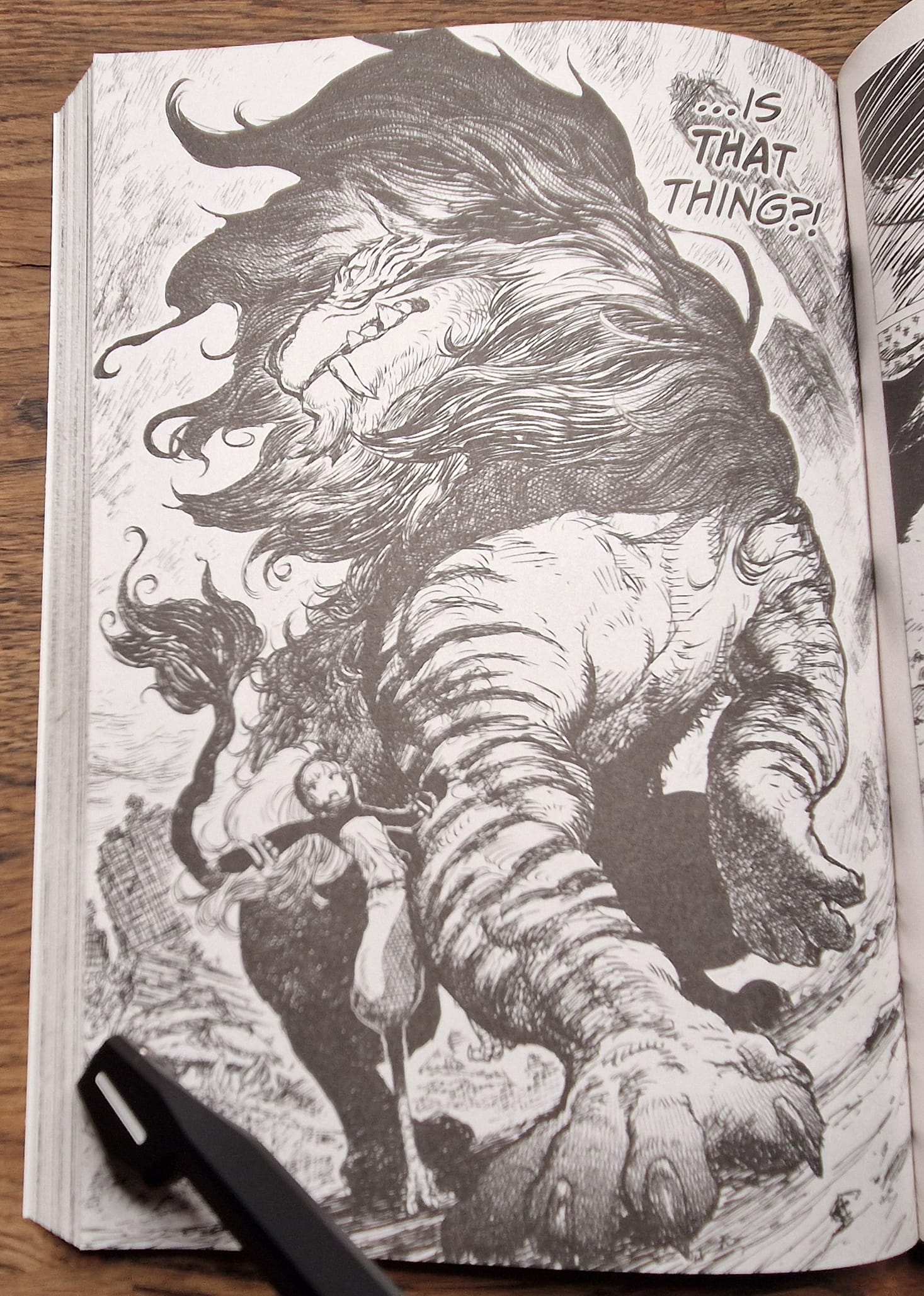 The art in this manga is damn good, y'all. I'm not artistic enough to critique it in any great detail, but nearly every page has at least one panel where I went "damn". The character and creature designs are enough to impress on their own—as you can hopefully see despite my amateurish photography work above—but the environments are, in my opinion, fantastic. Ippatu (the mangaka) has clearly put a lot of effort into rendering the ruins of Tokyo in great detail. The skyscrapers tower darkly over Leon, and the whole city has this sinister, dangerous feeling. Exactly what you'd want out of a grim post-apocalyptic survival story.